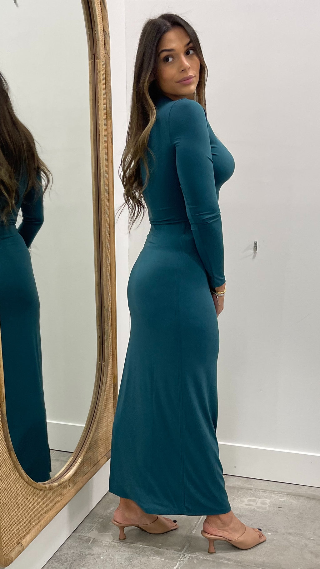 Elevate your wardrobe with the Hayleigh Deep Green Crop Top and Maxi Skirt Set. Featuring a fitted long sleeve crop top with a classic crew neckline and a high slit maxi skirt, this set combines comfort with a flattering, elegant silhouette. Crafted from soft, stretchy fabric, it offers effortless movement and sophistication. Perfect for day or night, wear it together for a stunning coordinated look or mix with other pieces to expand your style options. Make this versatile set your new go-to for any occasion.