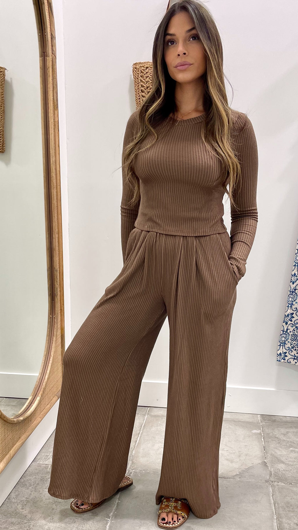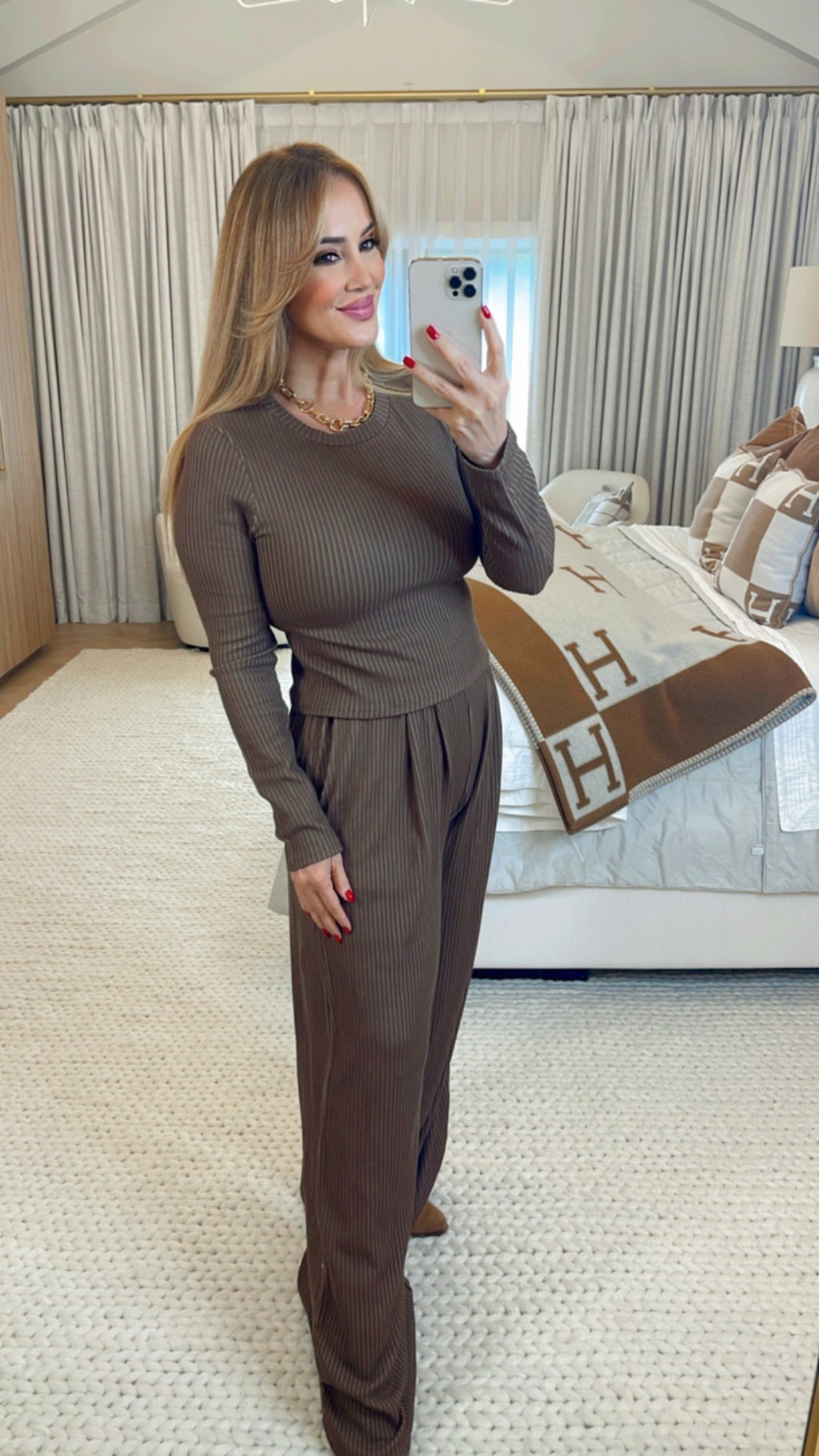 Experience ultimate comfort and style with the Espresso Ribbed Lounge Set. This cozy two-piece features a ribbed texture and a relaxed fit, perfect for fall days. The elastic waist pants offer easy wear and include pockets for convenience, while the long-sleeve top adds warmth and versatility. Ideal for lounging or casual outings, this set combines softness and functionality effortlessly.