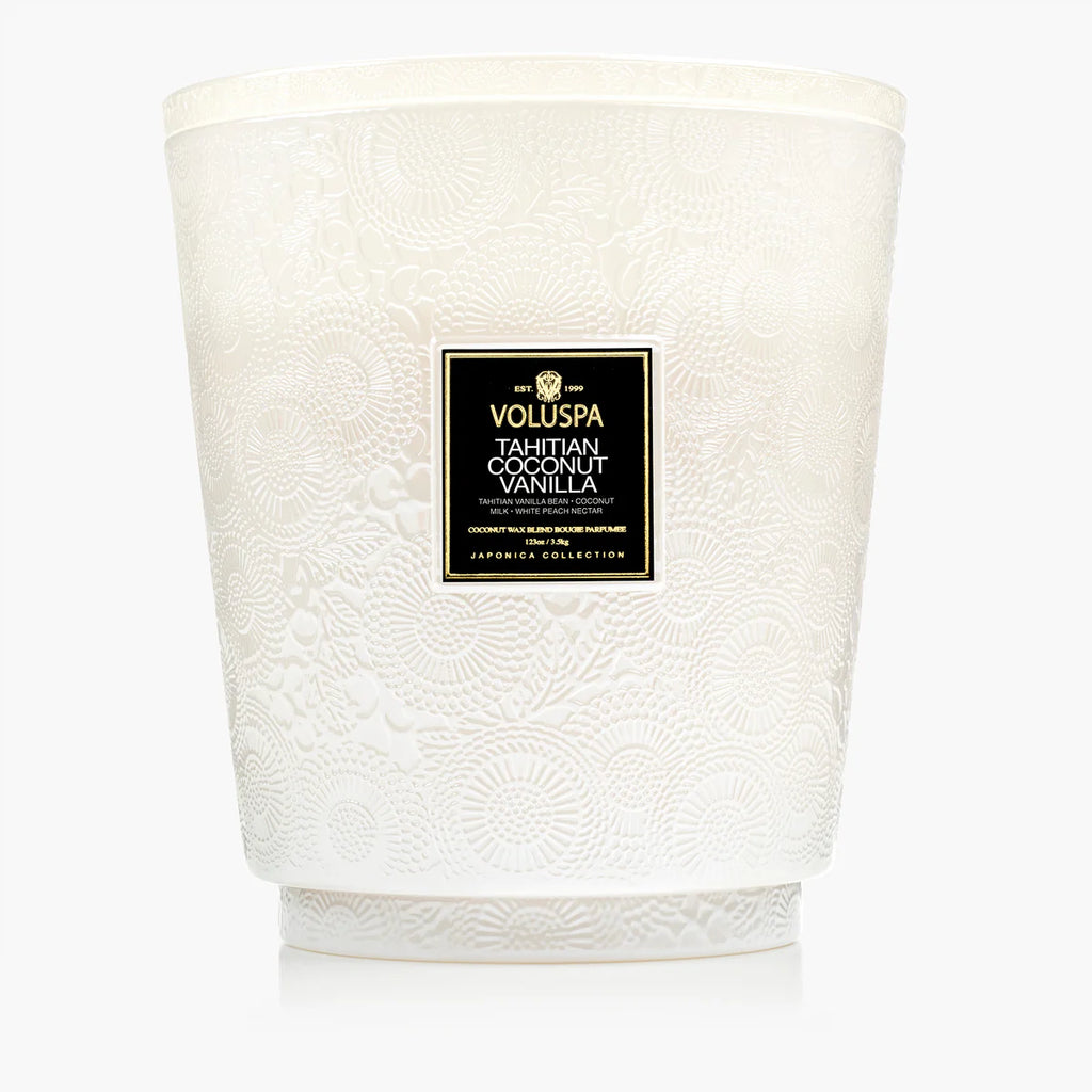 Voluspa's unique coconut wax blend is housed in a 123 oz. embossed glass vessel and topped with a matching lid that keeps the candle dust-free when not in use. Our five wicks allow you to enjoy fragrance throw for 250 hours. Our candles are handcrafted in the United States and feature our proprietary, clean-burning coconut wax blend and natural wicks. Our products are free of phthalates, parabens and sulfates and are never tested on animals. Up-cycle this best seller into a keepsake after the last burn.