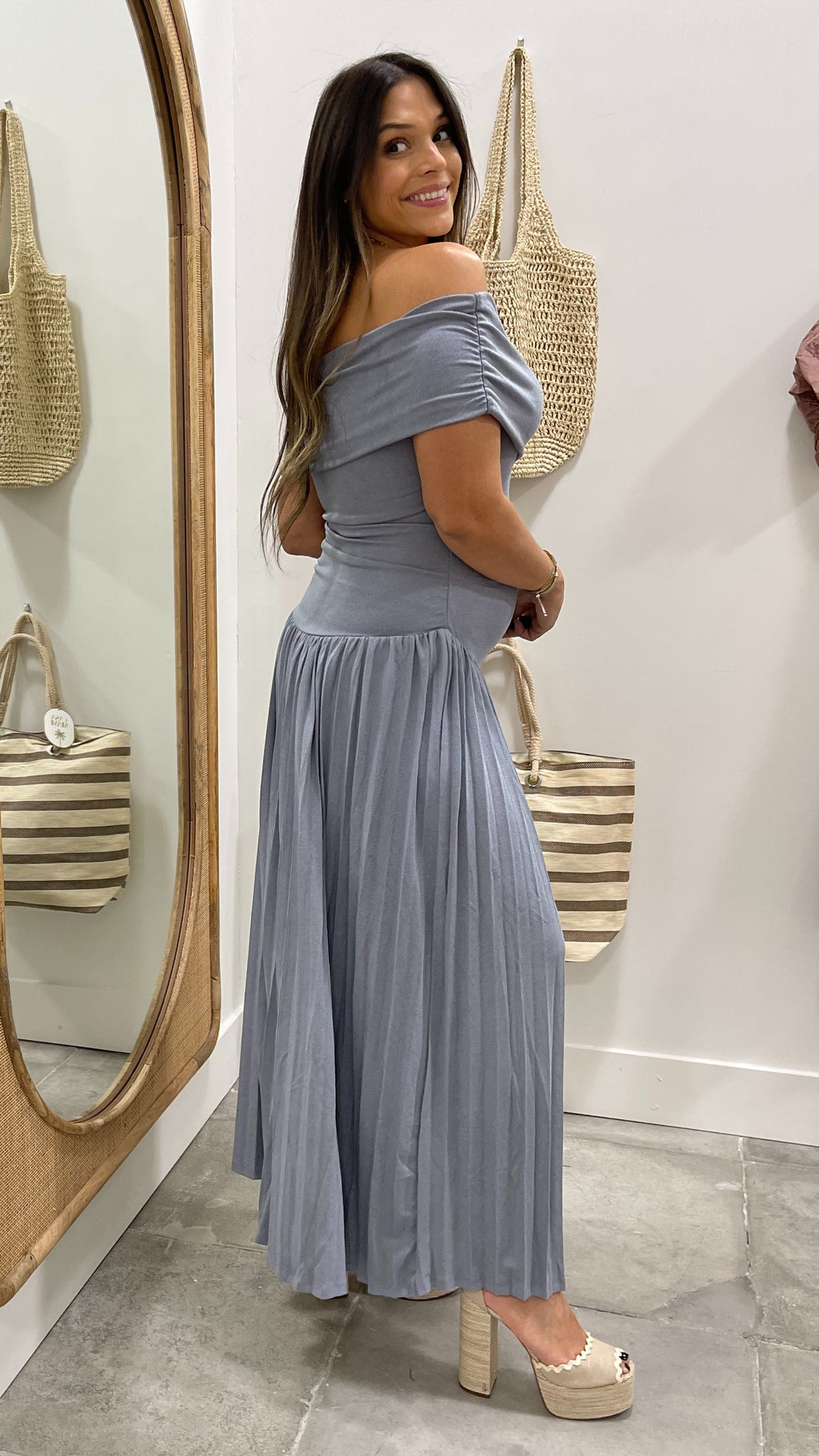 Elevate your wardrobe with the Ashton pleated maxi dress, a flowy off the shoulder design that captures effortless elegance. The ruched bodice gently drapes over the shoulders, while the pleated maxi skirt adds graceful movement with every step.